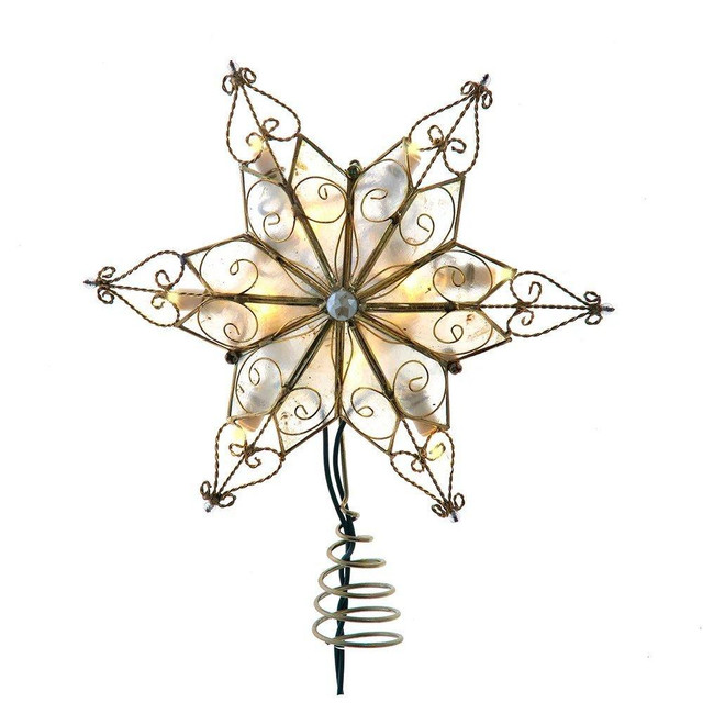 Elevate your holiday décor with Kurt Adler's 10-Light LED Star Treetop featuring elegant twisted scroll accents. This classic star design glows with 10 warm LED lights, adding charm and sophistication to your Christmas tree. The intricate scrollwork blends traditional style with modern flair, making it a perfect centerpiece for festive celebrations. Measures 9.45 in. x 2.17 in. x 9.45 in.