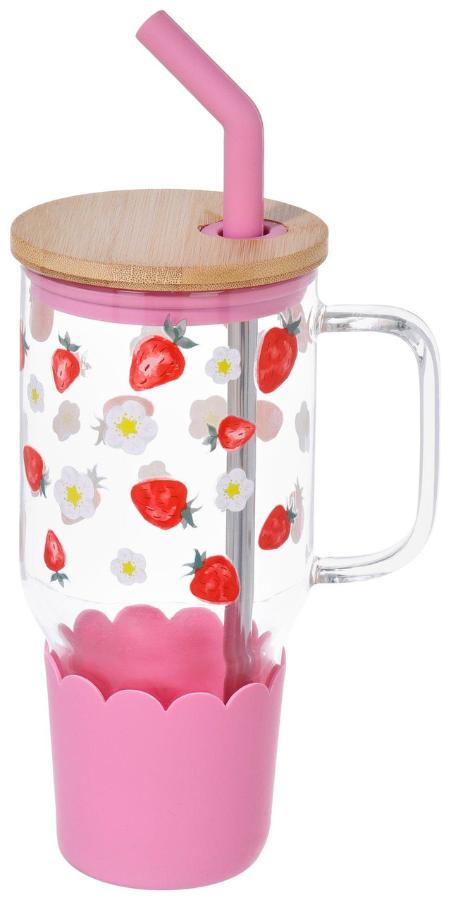 Sip in style on the go! The Floral Strawberry Adria Travel Tumbler features a 33 FL OZ glass body, stainless steel straw, wood lid, and a tapered silicone bottom for stability. With a built-in handle and a cute floral strawberry design, it is perfect for refreshing drinks with a touch of charm. Measures 4 in x 9 in