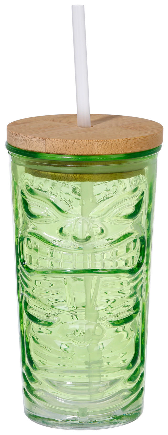 Add a playful touch to your next gathering with the Tiki Glass Sipper, perfect for tropical cocktails, smoothies, or any refreshing beverage. Comes with a wooden lid and reusable straw. Measures 3.5 in x 3.5 in x 7 in.