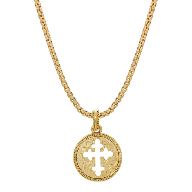 This simple yet elegant necklace features a cutaway Budded Cross design, with a box chain suspending a coin medallion pendant. Its stylish and inspirational look makes it perfect for daily wear or special occasions. The timeless design ensures it complements any outfit, adding a touch of grace and sophistication to your style. Length 20 in., width 19mm.