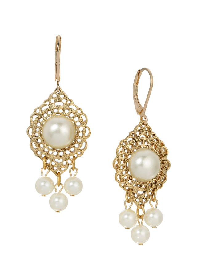 Add a classic update to your wardrobe with these beautifully designed faux pearl chandelier drop earrings. Featuring elegant filigree details, they exude a delicate, feminine charm with a vintage touch. Perfect for any occasion, these earrings bring timeless sophistication to your jewelry collection. Length 2.15 in., width 19mm.