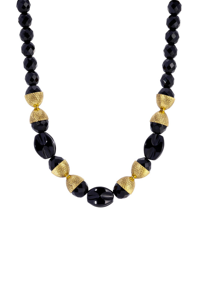 Add a pop of color to your wardrobe with this beautifully designed black acrylic bead and gold-tone bead strand necklace. Its vintage charm, elegant design, and feminine appeal make it a perfect accessory for any occasion. This versatile piece effortlessly enhances your style, adding a touch of sophistication to your look. Length 16 in., width 18 mm.