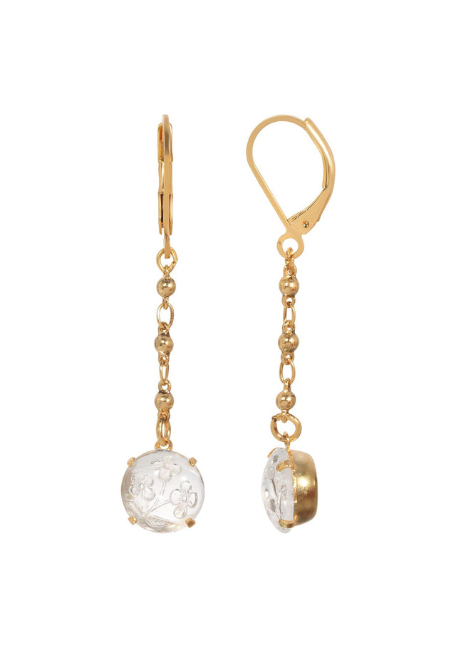 Our elegant dangling earrings feature round etched clear glass stones delicately suspended from 14K gold-dipped links. The lever back closures ensure a secure and comfortable fit, while the linear design adds a touch of sophistication. These feminine earrings are perfect for any occasion, effortlessly blending elegance and grace. Elevate your style with these exquisite pieces that showcase timeless beauty and refined craftsmanship. Length 2.5 in., width 19mm.