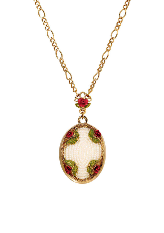 Elevate your vintage jewelry collection with this 1928 Jewelry faux pearl and red rose necklace. Featuring a 14k gold-dipped Figaro chain, an ornate oval pendant with ivory faux pearl center, and delicate rose and green enamel accents, this romantic necklace blends antique charm with timeless elegance. Perfect for vintage fashion lovers. Length 30 in., width 25mm.