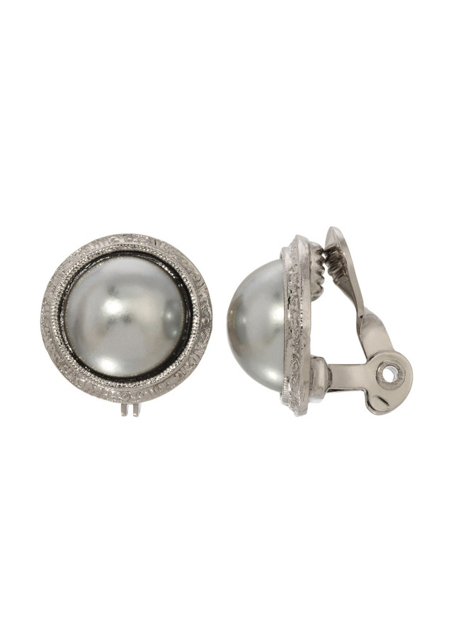 This elegant round pair of clip-on earrings boast a meticulously crafted framework, showcasing intricate detailing throughout. Adorned with a lustrous 14mm round grey faux pearl, these earrings exude sophistication and charm, perfect for adding a touch of understated glamour to any ensemble. Perfect for work, evenings out, or special occasions. Length .75 in., width 19mm.