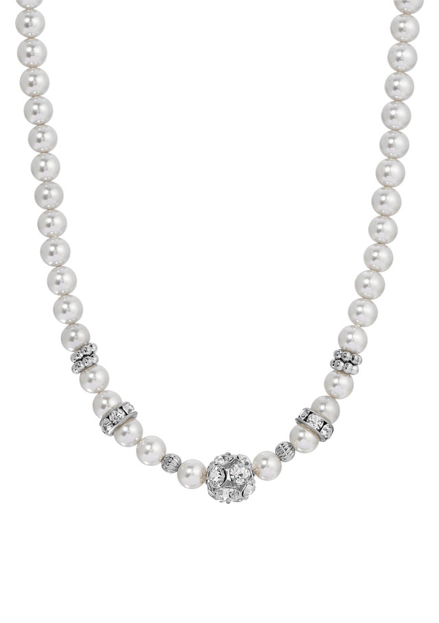 Elevate your elegance with this exquisite necklace featuring a strand of light grey round faux pearls. Delicate flower bead accents and shimmering rondelle crystal beads add a touch of sparkle, while the center fireball crystal creates a stunning focal point. Perfect for special occasions, this glamorous and sophisticated piece will make you shine with timeless beauty. Length 15 in., width 10mm.