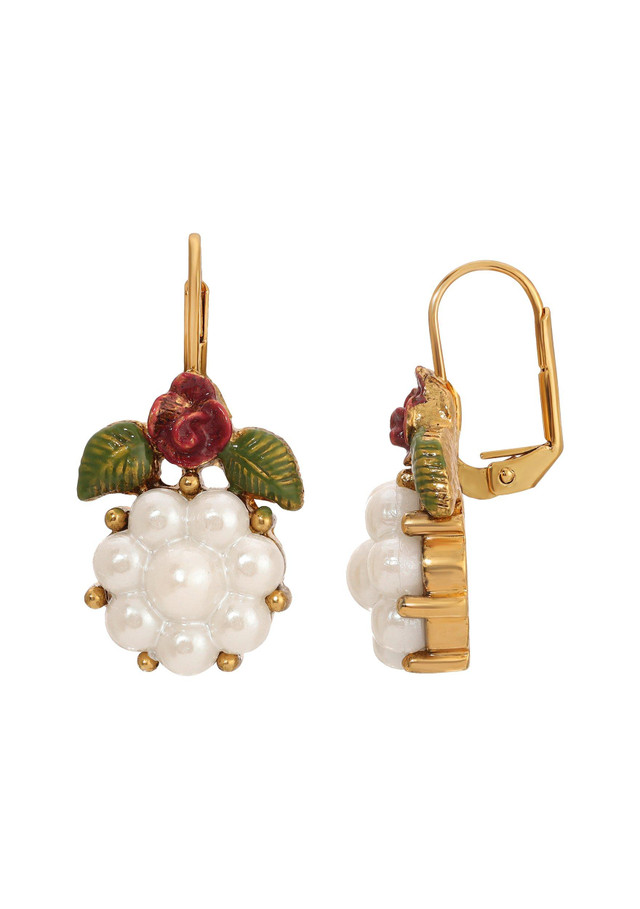 These chic and timeless earrings feature a faux pearl flower design adorned with delicate enamel roses. The green petals add a touch of nature-inspired elegance, while the lever back closure ensures a secure and comfortable fit. These feminine earrings gracefully dangle, making them a unique and sophisticated addition to any jewelry collection. Perfect for any occasion, they effortlessly blend delicate charm with timeless style. Length 1.15 in., width 15mm.