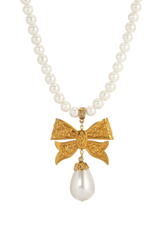 Add a feminine, elegant touch with this 1928 Jewelry Faux Pearl Gold Bow Necklace. A strand of faux pearls is accented by a gold-tone bow and teardrop pearl charm, creating a look thats both unique and sophisticated. Adjustable for the perfect fit, ideal for special occasions. Length 15 in., width 44mm.