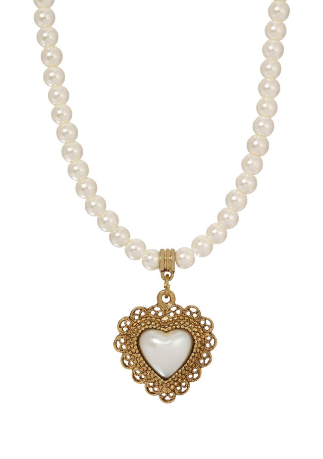 This opulent necklace features a 14K gold-dipped heart pendant with intricate filigree detailing and a white faux pearl center. Its elegant and detailed design exudes a symbolic charm, making it perfect for every occasion. Whether you're dressing up for a special event or adding a touch of sophistication to your everyday look, this necklace is a timeless accessory that enhances any outfit with its refined beauty. Length 15 in., width 24mm.