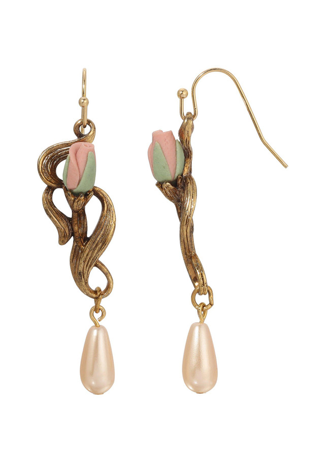 These vintage dangle earrings feature delicate pink porcelain rose buds hanging from luxurious 14K gold-dipped frames. Showcasing intricate craftsmanship, they are adorned with teardrop faux pearl accents, blending boho charm with sophisticated elegance. Perfect for special occasions, these unique earrings add a touch of timeless beauty to any outfit. Length 2.1 in., width 11mm.