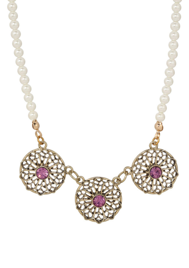 This exquisite necklace features intricate filigree work adorned with sparkling purple crystals and delicate faux pearl details. The design showcases elegant flower blossoms, adding a touch of nature-inspired beauty. With a secure lobster claw closure and adjustable length, this sophisticated piece is both unique and feminine, perfect for adding a touch of elegance to any outfit. Length 16 in., width 20mm.