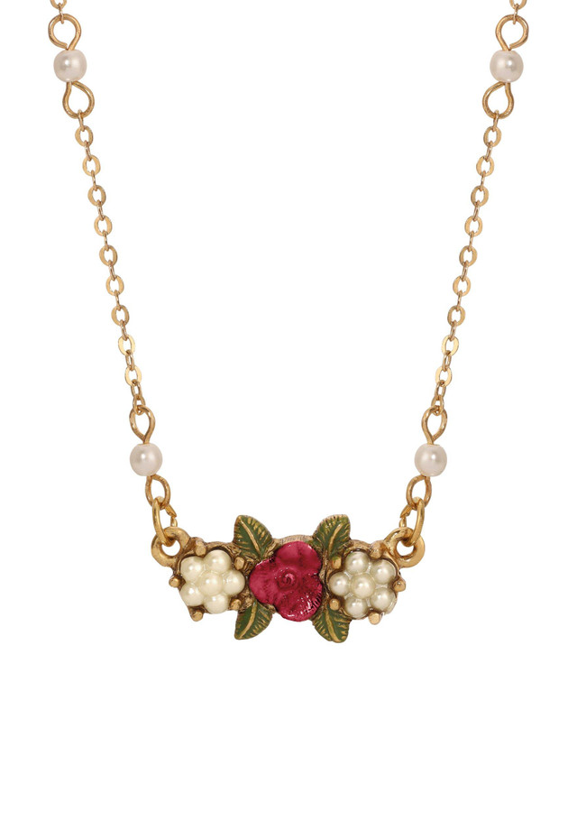 Add a touch of vintage romance with this 1928 Jewelry collar necklace. A delicate chain with faux pearl-accented links leads to a red rose centerpiece, nestled among petite faux pearls and green enamel leaves. Perfect for everyday elegance or special occasions. Length 16 in., width 25mm.