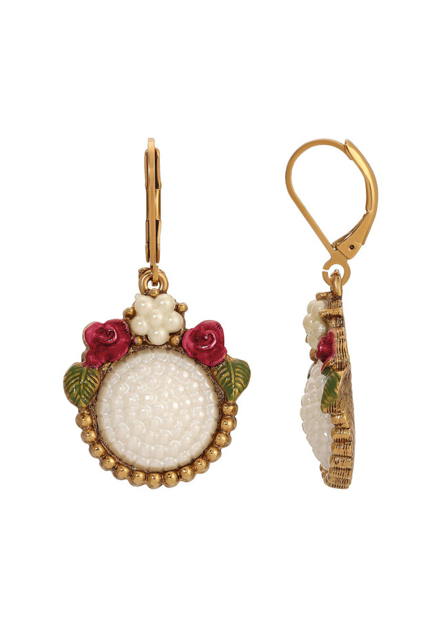 Delicate and charming, these 1928 Jewelry Faux Pearl Red Rose Drop Earrings feature a round faux pearl center framed by floral accentstwo sculpted roses, a petite white bloom, and green enamel leaves. With a vintage-inspired design and secure lever-back closure, they bring timeless beauty to any look. Length 1.7 in., width 20mm.
