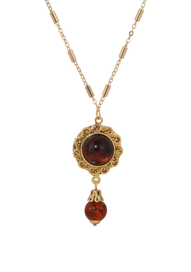 This enchanting locket pendant boasts a captivating floral-inspired swirly frame, featuring a beautiful stone that glistens in the light. Suspended below, a smooth bead elegantly dangles, adding a touch of movement to the design. This vintage-inspired necklace is a unique and elegant addition to your jewelry collection. Length 20 in., width 21mm.