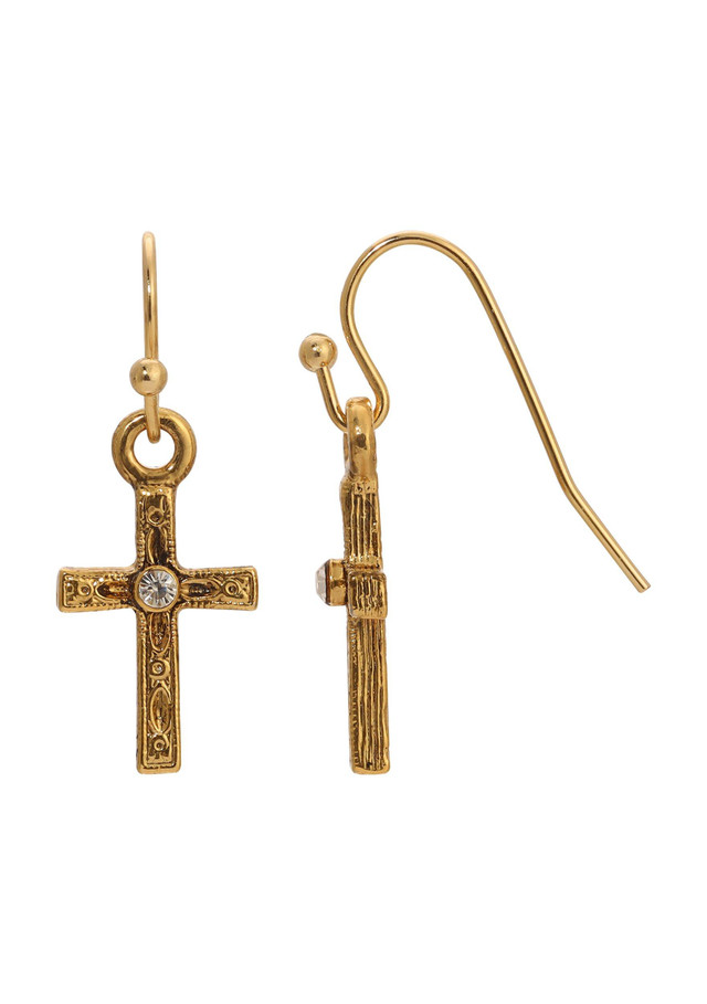 These cross earrings boast intricate detailing, each arm delicately embellished with ornate patterns, culminating in a round, brilliant crystal at their heart. Designed to be both elegant and striking, these earrings are a divine addition to any jewelry collection. Length .95 in., width 10mm.