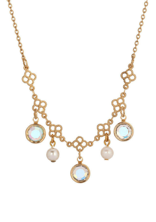 This bib-style necklace features intricate flower links interspersed with round faceted glass channel crystals, adding a touch of sophistication to its design. The 6mm white faux pearls offer a classic and elegant contrast to the sparkling crystals. With its delicate filigree detailing, this necklace combines timeless elegance with modern flair, making it a perfect statement piece for any occasion. Length 16 in., width 9mm.