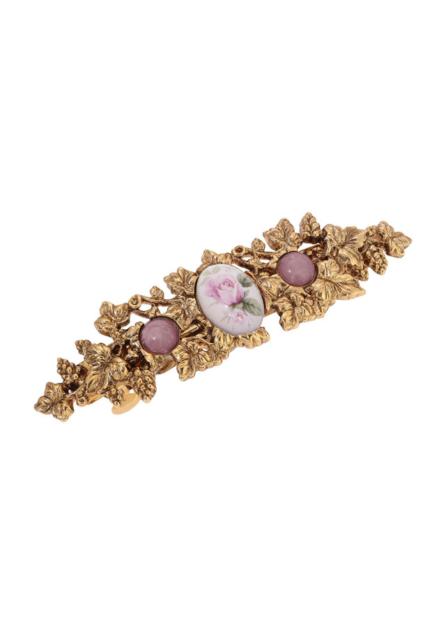 This stunning hair barrette embodies nature's beauty with its intricately detailed grapevine design intertwining delicately around a round pink rose decal. Accented with round pink moonstones on each side, it exudes an enchanting allure reminiscent of a blooming garden in springtime. Length 3.7 in., width 25mm.