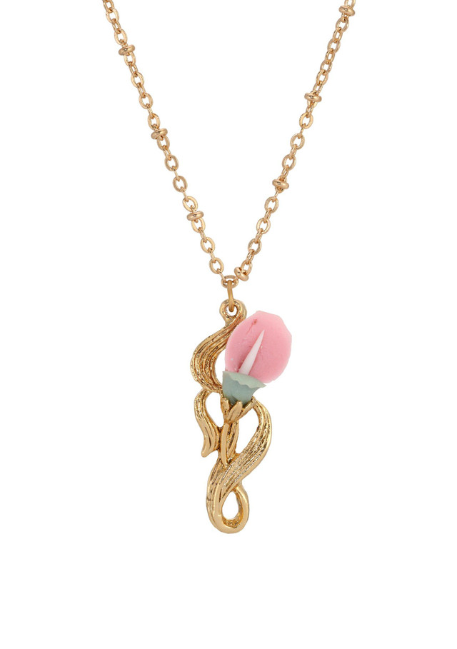 Romantic and timeless, this 1928 Jewelry necklace features handcrafted pink porcelain roses nestled in flowing 14K gold-dipped vines. With sculpted floral details and soft hues, it captures the charm of a blooming garden, an elegant, feminine piece perfect from day to evening. Length 18 in., width 15mm.