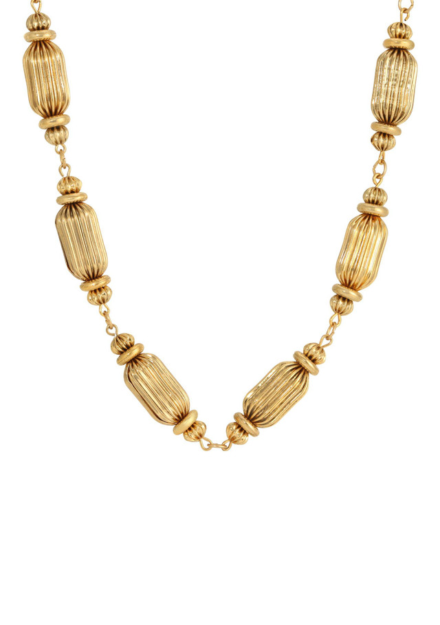 This sophisticated necklace features 14K gold-dipped linked rondelle and fluted round donut beads, creating a refined and classic design. Its vintage-inspired elegance exudes timeless femininity, making it the perfect accessory for special occasions. The intricate craftsmanship and luxurious materials ensure this piece adds a touch of class and sophistication to any outfit, making it a cherished addition to your jewelry collection. Length 16 in., width 10mm.