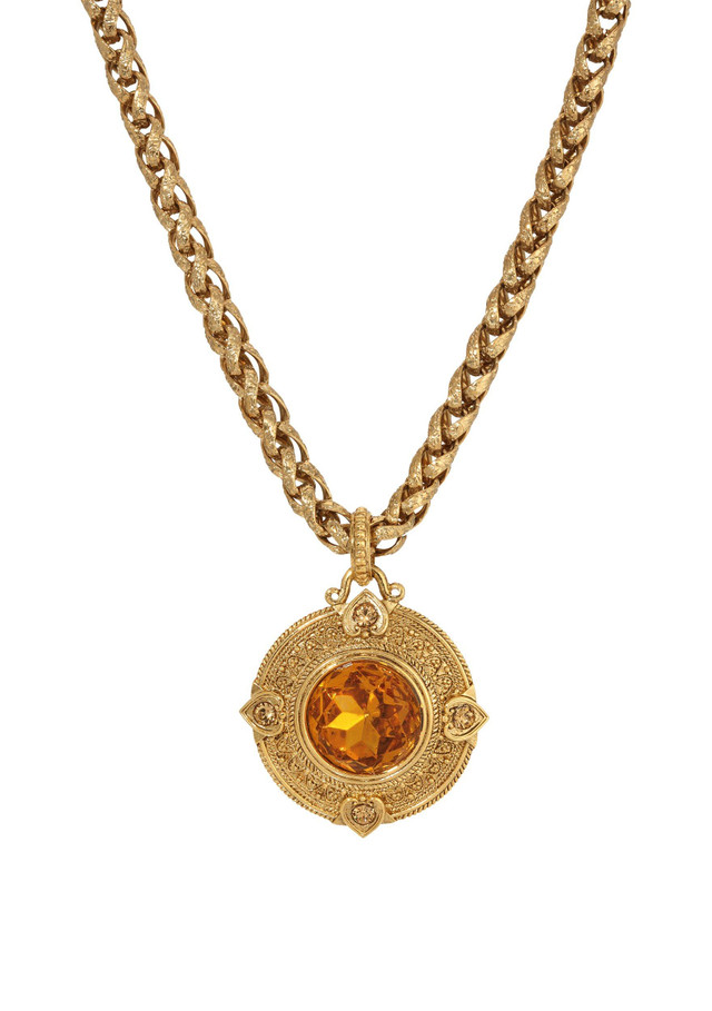 This intricately crafted round pendant boasts delicate heart motifs flanking its circumference, each adorned with shimmering topaz crystals for a touch of elegance. At its center, a captivating large round topaz crystal steals the spotlight, catching the light with its mesmerizing brilliance. Length 16 in., width 44mm.