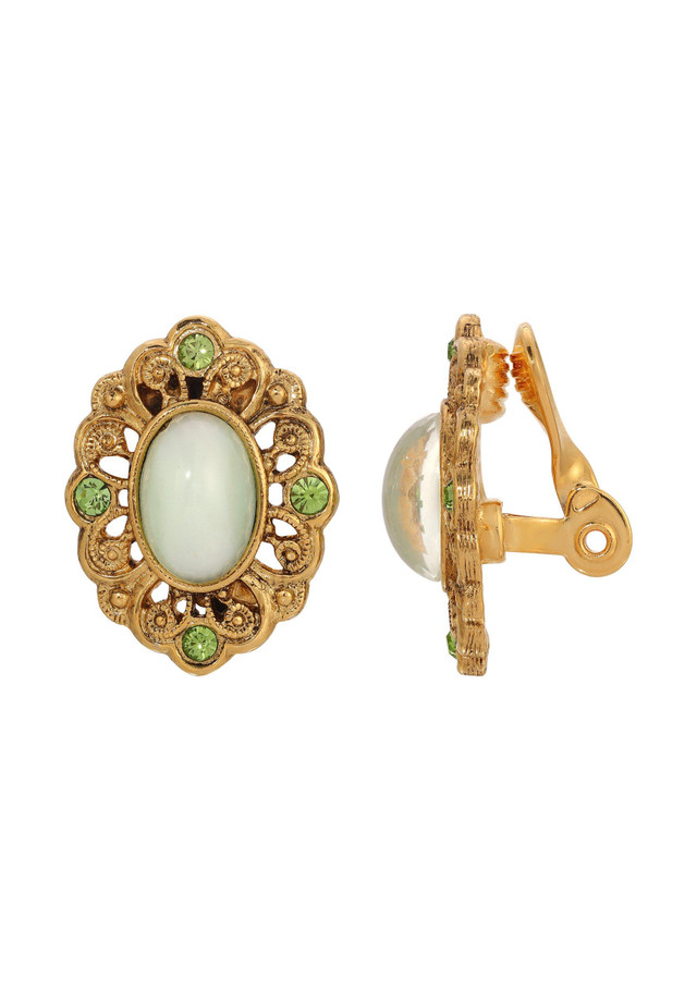 Elevate your elegance with these stunning 14K gold-dipped filigree earrings. Featuring intricate detailing and an oval green cat's eye center, these earrings are accented with sparkling green peridot crystals. Their delicate and feminine design makes them perfect for any occasion. The clip-on style ensures comfort and ease of wear, adding a touch of sophistication to your look. these earrings are a timeless addition to your jewelry collection. Length 1 in., width 20mm.