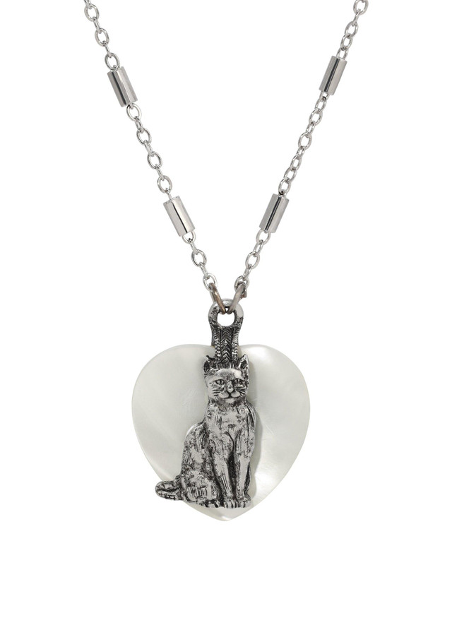 Add a touch of whimsy and elegance to your look with this charming necklace featuring a detailed sitting cat pendant and a heart-shaped mother of pearl. This fun and vintage-inspired piece is a true talking point, perfect for every occasion. The 3-inch extender ensures a comfortable fit, making it a versatile addition to your jewelry collection. Whether for a special event or everyday wear, this necklace combines playful charm with sophisticated style. Length 18 in., width 25mm.