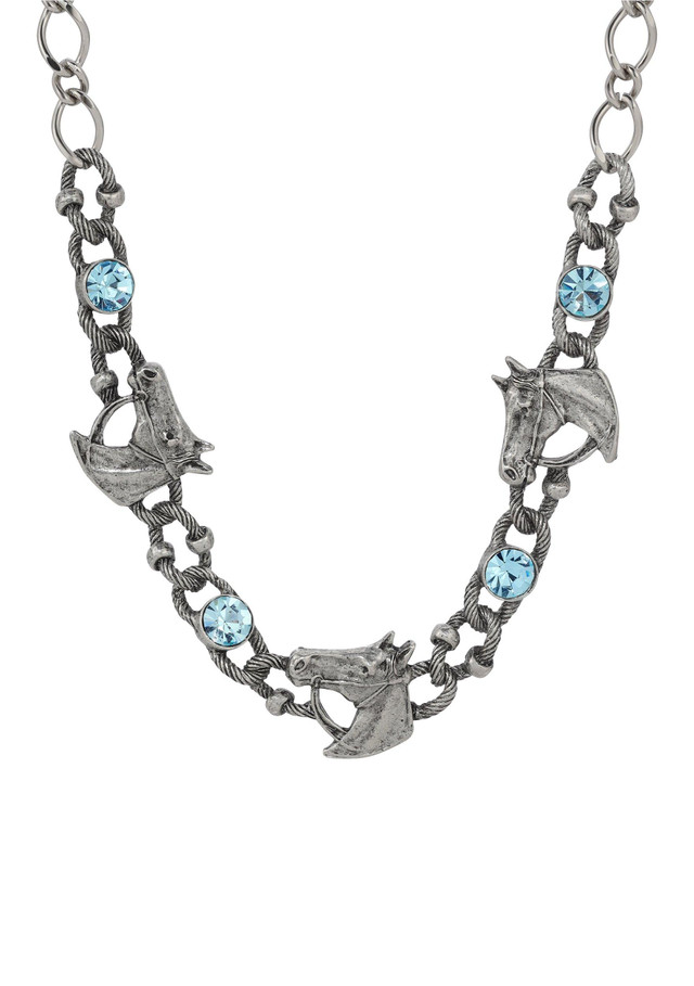 This rope-link necklace beautifully combines equestrian allure with exceptional craftsmanship, featuring intricately linked horse heads adorned with aqua blue crystals. The textured rope-style links add depth and dimension, while the vibrant crystals provide a refreshing burst of color. This unique piece is perfect for adding a touch of elegance and individuality to any outfit. Length 16 in., width 15 mm.