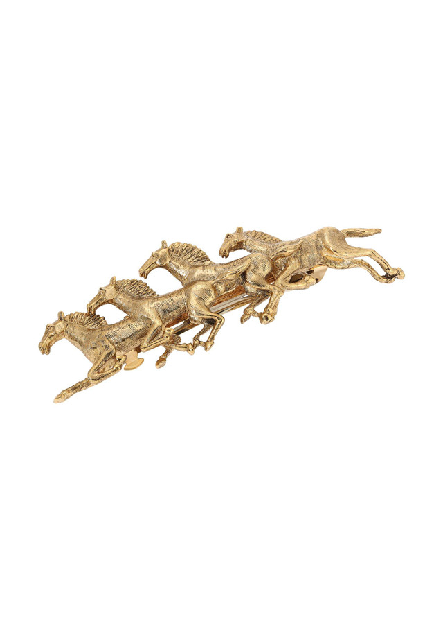 This hair barrette showcases the dynamic motion of galloping colt horses against a gleaming backdrop. Featuring a French hair barrette closure, it offers both style and functionality for effortless hairstyling. Length 3.75 in., width 31mm.