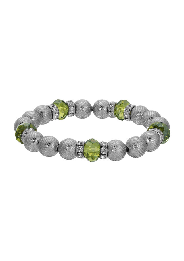 This stretch bracelet boasts a delightful combination of textured round swirl beads, accented by sparkling rondelle crystal spacers and multi-faceted crystals. The intricate play of textures and shimmering crystals creates a captivating visual appeal, adding a touch of glamour to any ensemble. Length 7 in., width 10mm.