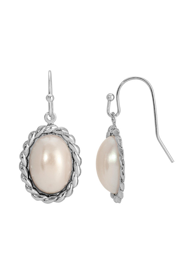 Keep it simple and classy with these beautiful earrings! Featuring an oval rope frame with a light texture, they showcase an oval faux pearl stone at the center. The earrings dangle elegantly from fish hook backings, adding a touch of classic femininity to any outfit. Length 1.2 in., 14mm.