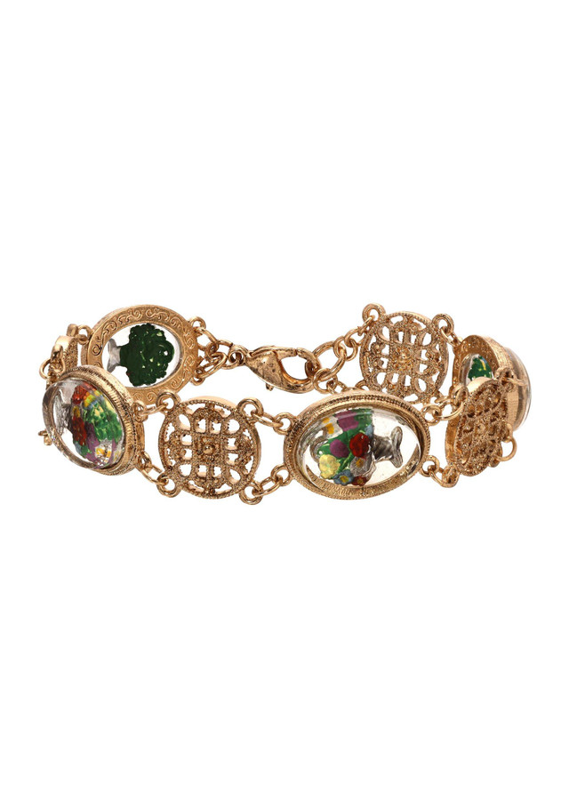This bracelet showcases a delicate design with round filigree links intricately woven to highlight oval glass stones. Each stone features intricate flower motifs accented by green petals, adding a natural charm to the piece. Secured with a lobster clasp closure. Length 7.75 in., width 15mm.