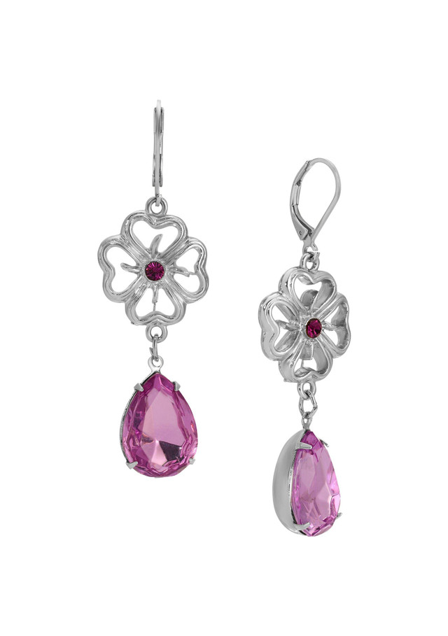 Gracefully elegant, these 1928 Jewelry Purple Flower Crystal Teardrop Earrings feature a delicate four-leaf clover design with a sparkling amethyst crystal center. A pear-shaped drop adds movement and rich color, while silver-tone metal enhances the whimsical charm. A timeless touch of floral sophistication. Length 2.5 in., width 18mm.