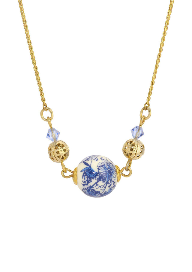 Go back in time with the 1928 Jewelry Round Blue & Gold Bead Necklace. This elegant collar necklace features a classic mix of blue and white round beads, accented by light blue lantern beads and delicate gold-tone filigree details. Feminine and vintage-inspired, its perfect for daily wear or adding a graceful touch to special occasions. Length 16 in., width 12mm.