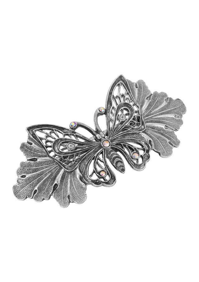 This hair barrette showcases a beautifully intricate vintage design, featuring a detailed butterfly adorned with AB crystal accents. Delicately resting on an ornate leaf, this piece exudes a sense of elegance and sophistication. Perfect for adding a touch of whimsical charm to any hairstyle. Length 3.75 in., width 29mm.