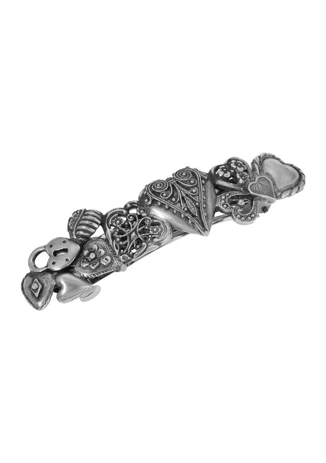 This hair barrette boasts a charming array of hearts, each unique in design, creating an enchanting and eclectic arrangement. Crafted with care, this accessory is a delightful addition to any hairstyle, infusing it with a touch of playful elegance. Length 3.6 in., width 25mm.