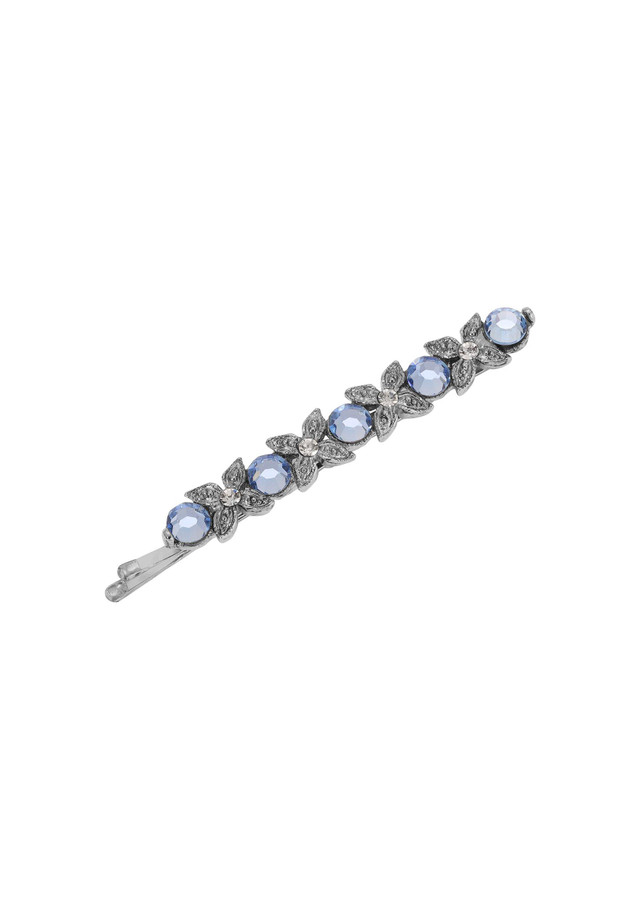 This bobby pin exudes delicate charm with its quartet of intricately designed flowers, each boasting a sparkling clear crystal at its heart and complemented by subtle light blue accents between them.. Length 2.25 in., width 8mm.