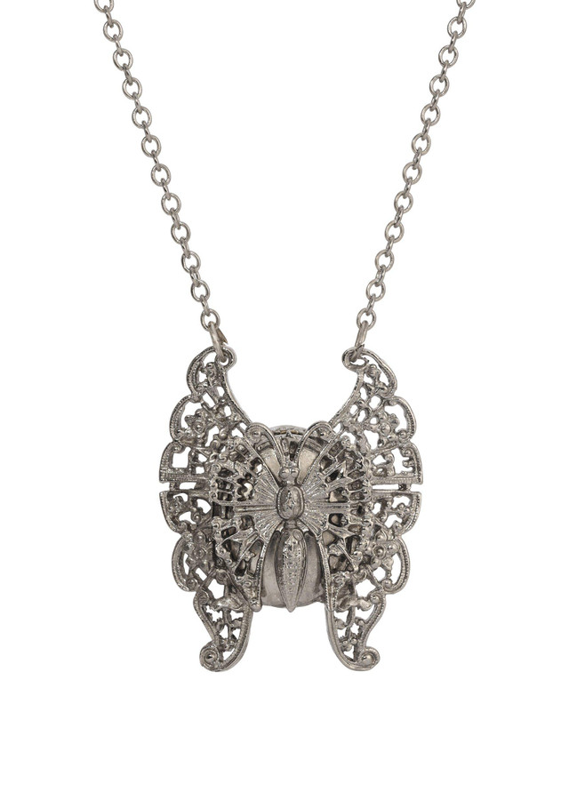 This vintage-inspired butterfly pendant exudes intricate charm, boasting ornate details reminiscent of a bygone era. Complete with a double photo locket, it offers a sentimental touch to any ensemble. Suspended elegantly from a cable chain secured with a lobster clasp closure. Length 28 in., width 31mm.