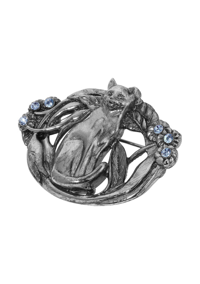 This captivating pin showcases a charming sitting cat, encircled by intricately intertwined vines, lush leaves, and 6 delicate flowers adorned with shimmering light blue crystals. The cat's serene posture and the vibrant floral motif evoke a sense of tranquility and nature's beauty. Length 2.3 in., width 40mm.