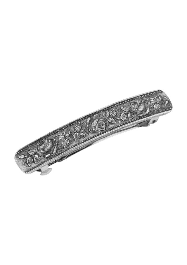 This hair barrette embodies timeless elegance with its intricate ornamental details of three delicately crafted roses accompanied by lush leaves. The roses, each representing love and beauty, symbolize grace and sophistication, making this accessory a perfect addition to any ensemble. Length 2.8 in., width 13mm.