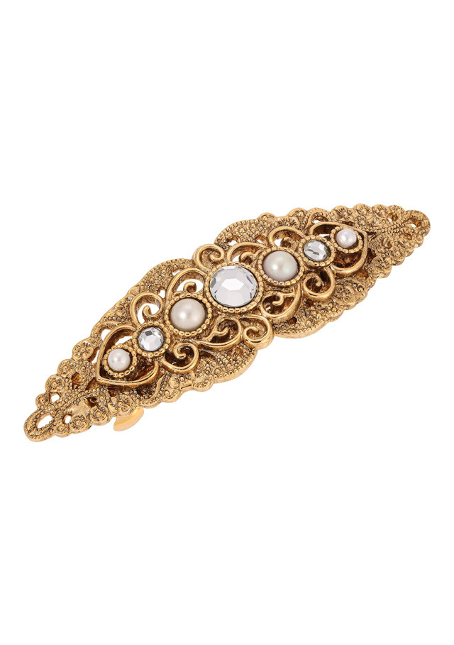 Introducing our Splendor Filigree & Stones Hair Barrette, a luxurious accessory inspired by the Art Deco period. This exquisite piece features intricate filigree work adorned with round clear crystals, while the gold version features crystals and lustrous faux pearls, creating a dazzling contrast. Length 3.75 in., width 29mm.