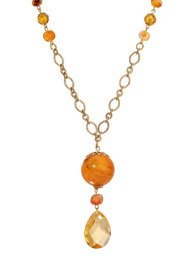 This Y-necklace exudes sophistication with its intricate blend of rope and diamond chains intertwined with carnelian marble effect nugget beads and topaz glass crystals. The focal point is a captivating round faux amber bead, complemented by delicate light topaz Briolette glass crystals. Length 28 in., width 21mm.