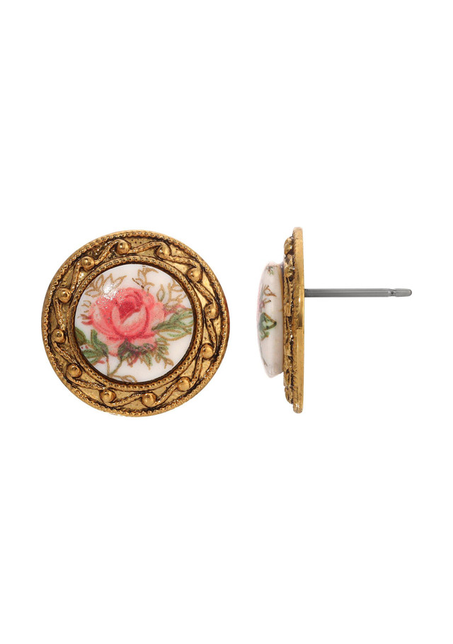 These elegant earrings feature a post back closure and 14K gold-dipped finish, exuding vintage charm. Adorned with a delicate pink desert rose decal, they evoke a sense of nostalgia and femininity. Perfect for every occasion, these earrings add a touch of elegance and timeless beauty to any outfit. Length .6 in., width 15mm.