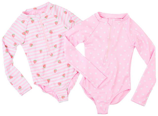 This 2-pack of long sleeve rash guards features one in a sweet strawberry print and the other in pink with white polka dots. Made from soft, stretchy fabric with UPF 50+ sun protection, theyre perfect for sunny days at the beach or pool. Designed for comfort and style, these rash guards keep your little one safe while looking adorable.