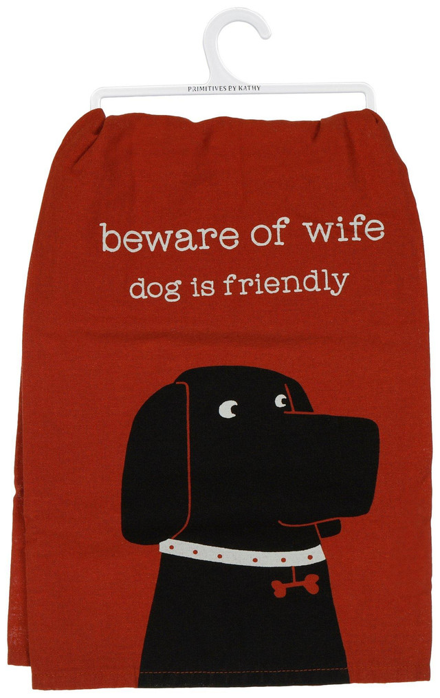 Add humor to your kitchen with the 28 x 28 inch Dog Is Friendly Kitchen Towel! Featuring a playful dog print and the cheeky script Beware of Wife, Dog Is Friendly, this 100% cotton towel is soft, absorbent, and perfect for dog lovers with a sense of humor.