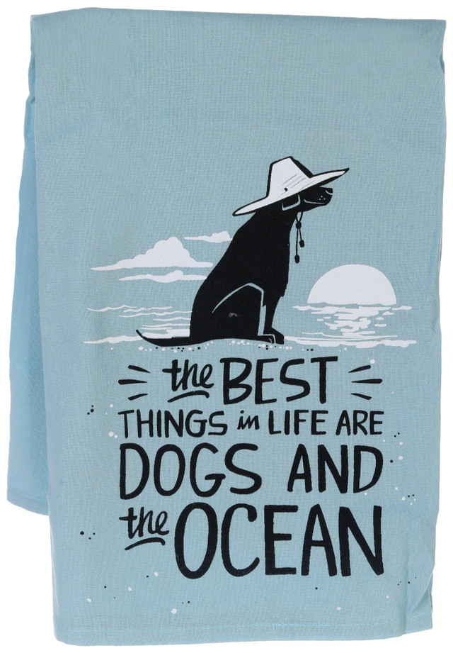 Celebrate coastal charm with this blue kitchen towel featuring a cheerful dog on the beach at sunset wearing a beach hat. Made from 100% cotton, it combines playful style with absorbent softness, making it a heartwarming and functional accent for any seaside-inspired space.