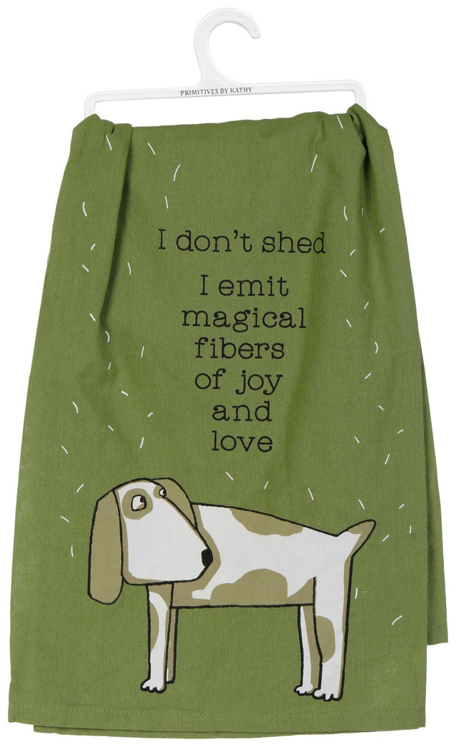 Add a dose of dog-loving humor to your kitchen with the 28 x 28 inch I Dont Shed Kitchen Towel! Made of 100% cotton, it features a charming dog screen print and the playful script: I Dont Shed. I Emit Magical Fibers of Joy & Love.