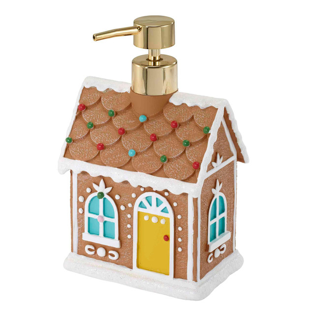 Sweeten your holiday décor with the Avanti Sweet Treat 3-Pc. Lotion Dispenser and Fingertip Towel Set. The hand-painted resin dispenser features a festive gingerbread house with colorful accents and glitter. Two velour fingertip towels showcase a smiling gingerbread man with scarf and buttons, finished with a red borderperfect for adding seasonal charm to any space. Towel Measures 11 in. x 18 in. Pump Measures 4.63 in. x 3.25 in. x 4.63 in. Part of the Avanti Sweet Treat Collection.