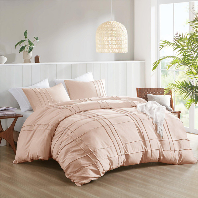 Refresh your bedroom with the 510 Design Porter Soft Washed Pleated Duvet Cover Set. Featuring a modern grid pinch pleat design, this breathable, pre-washed microfiber set offers year-round comfort and a gentle touch on skin. Stylish and soothing, it is perfect for relaxing and recharging.