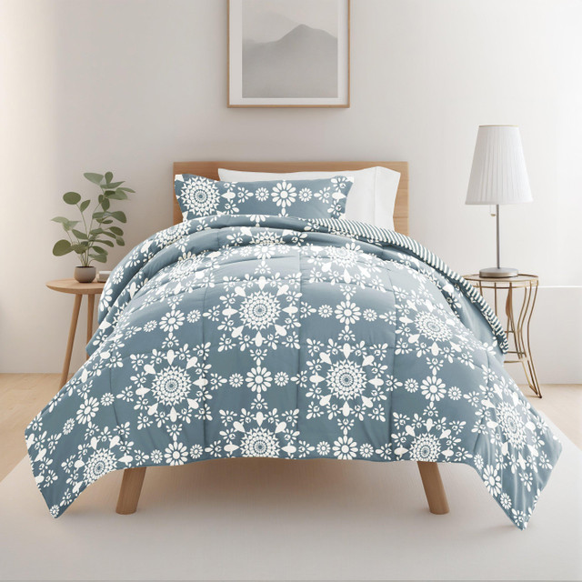 Prepare for college life with the Ultimate College Essentials Bedding Bundle. This all-in-one set features a a vibrant patterned comforter and a matching solid sheet set, both crafted from soft, durable microfiber. TwinXL - Bundle Contents and Size Guide: 1 Laundry Bag (20 x 28), 2 pillows (20 x 28), 70 x 90 Comforter, 20 x 26 Pillow Sham with 2 flange, 1 flat sheet (66 x 102), 1 fitted sheet (39 x 81 x 16) and 1 pillowcase (20 x 30). Machine Wash Cold.