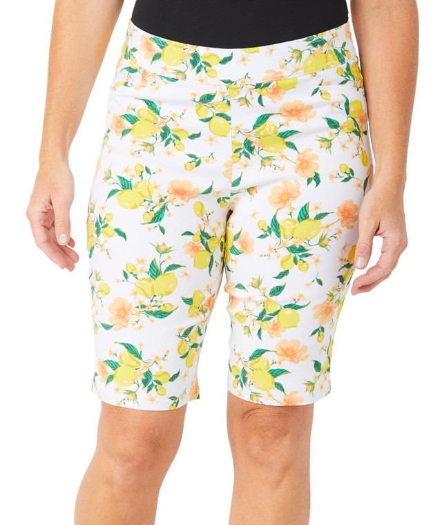 These bermuda shorts feature a stretchy material and a sleek design with faux front pockets. The comfortable fit offers ease of movement. Ideal for casual wear, they pair well with tanks, tees, or blouses. Fabrication is 76% rayon, 21% nylon, and 3% spandex.
